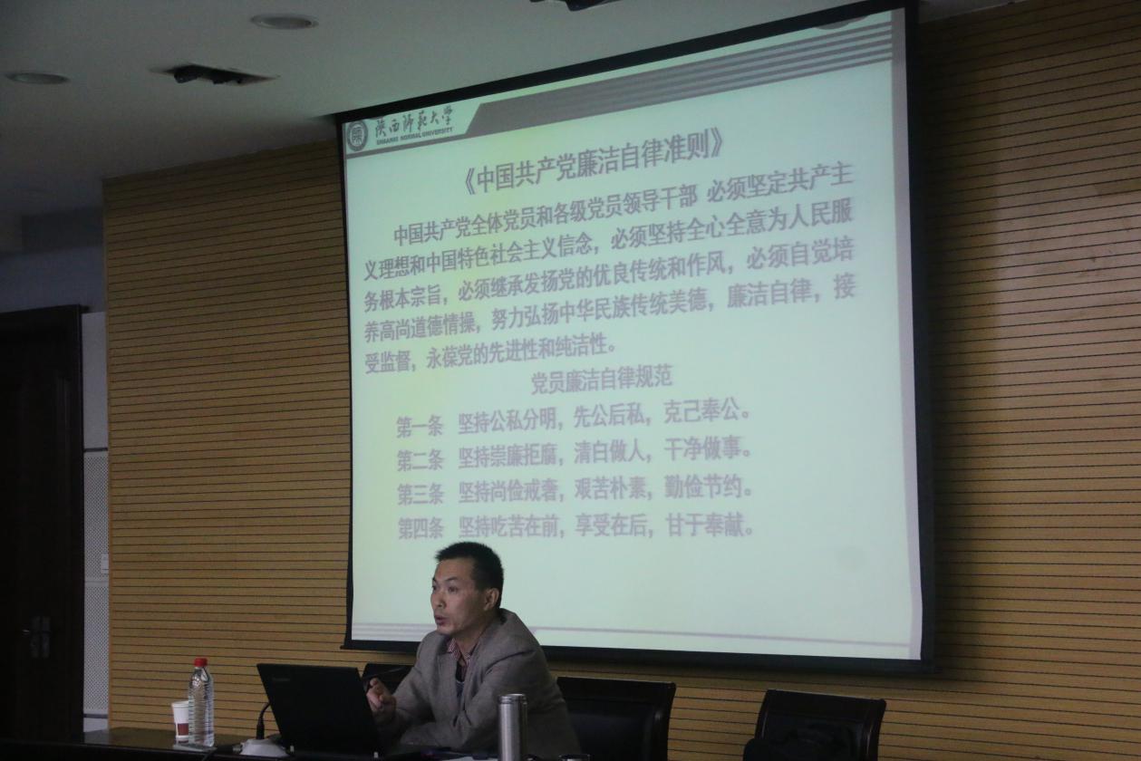 讲座中,闫老师首先详细解读《中国共产党廉洁自律准则》和《中国共产党纪律处分条例》,深入阐述如何成为一名优秀的共产党员,即遵纪守法、廉洁自律。他从“反四风”、“三严三实专题教育”、“两学一做”学习教育等方面指出党员就要起带头作用——修身、齐家。既要廉洁自身、遵纪守法,也要能做事、会做事。接着,闫老师还以一些典型案例,再次强调作为党员,要树立政治纪律和政治规矩的认识,始终保持清醒坚定的政治立场,模范遵守党章,坚决维护纪律,在政治上讲忠诚、在组织上讲纪律、在行动上讲原则,始终站在党的立场上想问题、办事情。最后闫老师送给同学们两句话:心中有党,对党忠诚,在党为党;学规矩、讲规矩,是党员永远的必修课。