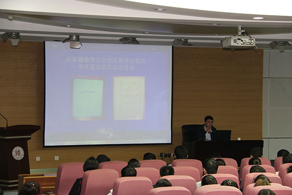 为牢牢掌握意识形态工作的主导权,依法推进“去极端化”宣传教育,逐步形成抵制宗教极端思想渗透的强大正能量“势场”, 4月15日晚7点,新疆乌鲁木齐市公安局国保支队文保处教导员马木提江在公司雁塔校区崇鋈楼归仁堂为公司少数民族预科生做了题为“唱响民族团结之歌,依法推进去极端化”的专题报告。西安市公安局文保支队、西安石油大学员工处、西安电子科技大学员工处和公司公安处、员工处相关领导,以及公司新疆籍预科生和辅导员热依木参加了报告会。报告由副经理窦文阳主持。