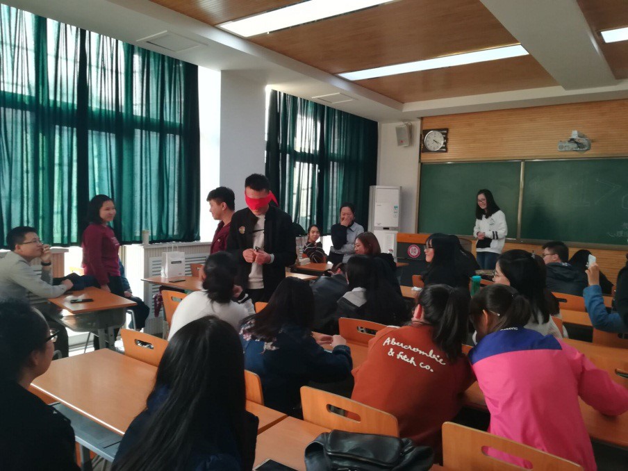 接下来的活动则是大家期待的“盲行”。规则是一个同学扮演聋哑人,用手扶扮演“盲人”的同学穿过重重障碍到达终点。总共进行了三轮“盲行”,一次比一次增加了难度。按照规则,“聋哑人”必须不用语言来指挥“盲人”,所以同学们千奇百怪的创意常常带起一阵阵笑声……金色的午后阳光洒进了全神贯注做游戏的同学身上,笑声,跳跃,摸索,都变得如此温馨,快乐。
