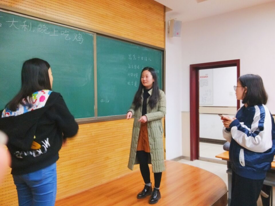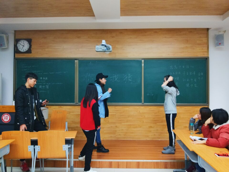 活动第一项为“你画我猜”。在此环节,有三组同学上台来进行竞争比赛,看谁猜出的词语最多。一名同学来通过动作、语言等方式来让另一位同学猜出相应的词语或者是成语。三组同学配合默契,游戏过程之中台下的观众们也看的津津有味。其中杨洋、袁敏、于佳淼组合猜出的词语最多,最终取得了胜利。张慧宇组合猜出的词语最少最终收到了惩罚。