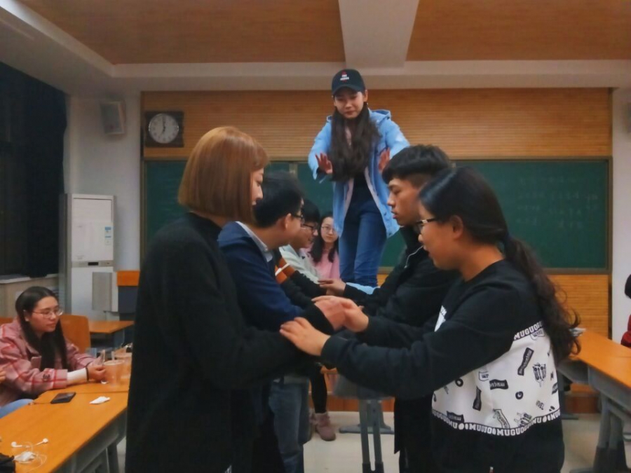 活动第二项为“信任背摔”。在此环节,背摔同学必须要对下面接住的同学具有一定的信心,这项活动不仅惊险刺激,同时也增加了同学们之间对彼此的信任感。李晓妍和咸敏同学参加了背摔,两位同学两次都被同学们所接住。整个过程中,背摔的同学们虽然有压力和害怕,但是当她们倒下的那一刻,心中都是出于同学们的信任。