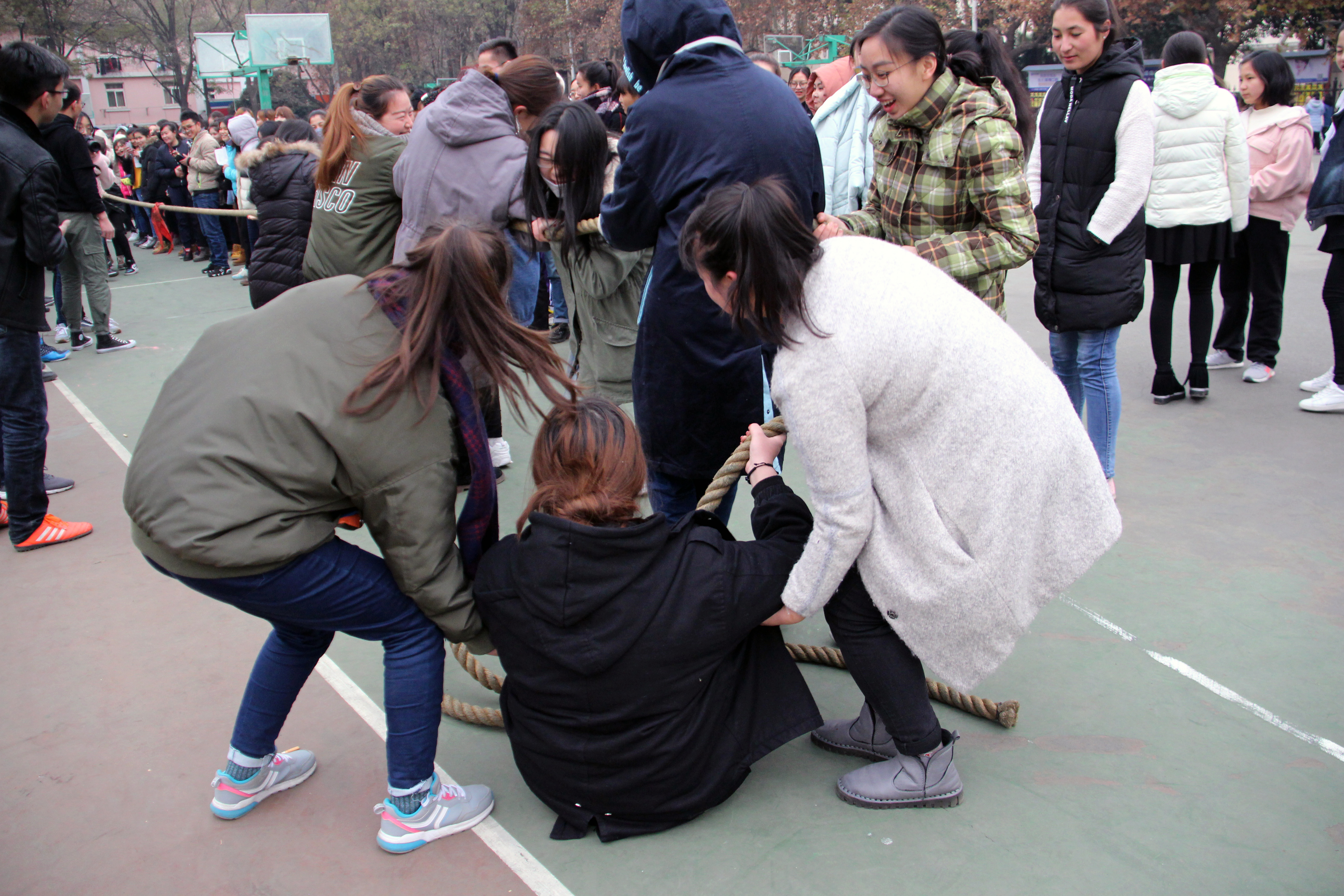 当比赛的哨声一响起,队员们口中一齐高呼着“一二,一二”,双手紧握长绳,憋足了劲拼命往后拉,在场观赛的同学们自发组成啦啦队为参赛人员加油。呐喊声此起彼伏,裁判们依据公平公正的原则,参赛人员本着" 友谊第一,比赛第二" 的原则,整场比赛进行有序,过程激烈却又饱含乐趣。经过激烈的耐力,体力较量,最终分别评出男、女生参赛队伍前三名。