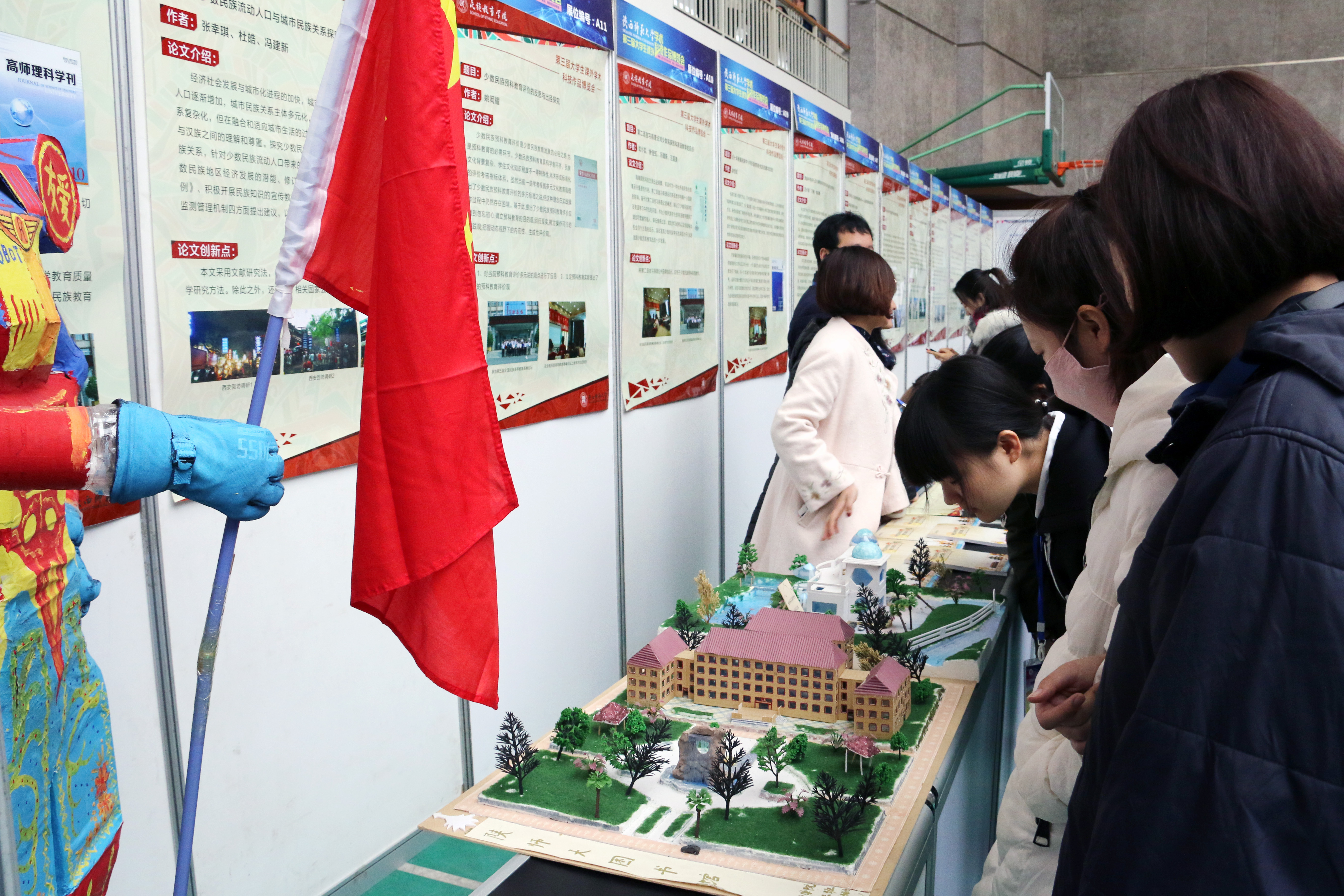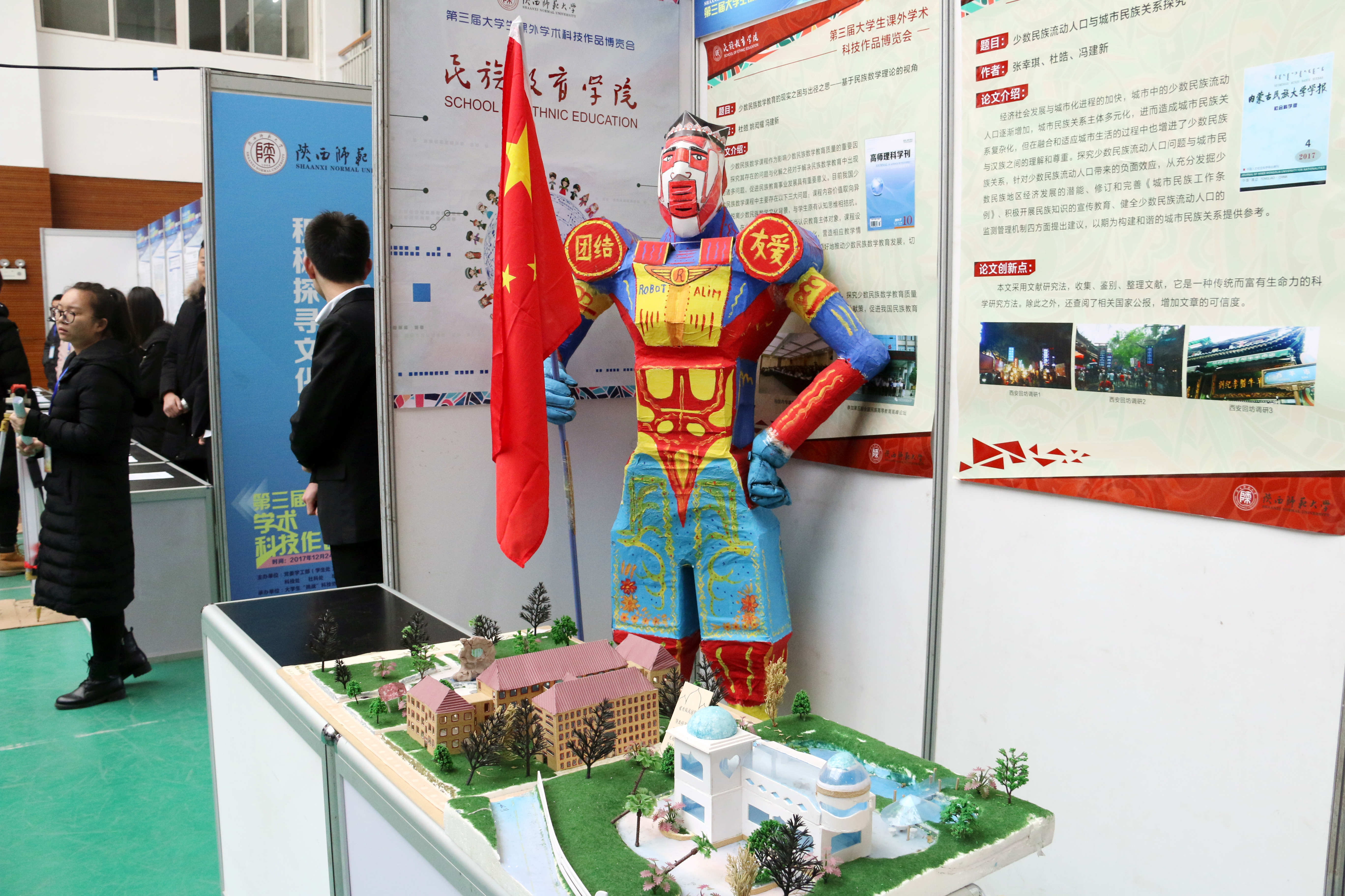 公司共有《满足少数民族预科生数学学习需求的多元、动态评估模式结构》、《多元文化背景下民族高校学前教育课程教学现状分析与思考》、《外来借词对维吾尔语的影响及对双语教学的启示》等13件作品参展,展台上摆着的名为《西域风情别墅》、《陕师大图书馆》的两个立体模型更是引起众人驻足拍照和讨论,场面一度十分热闹。