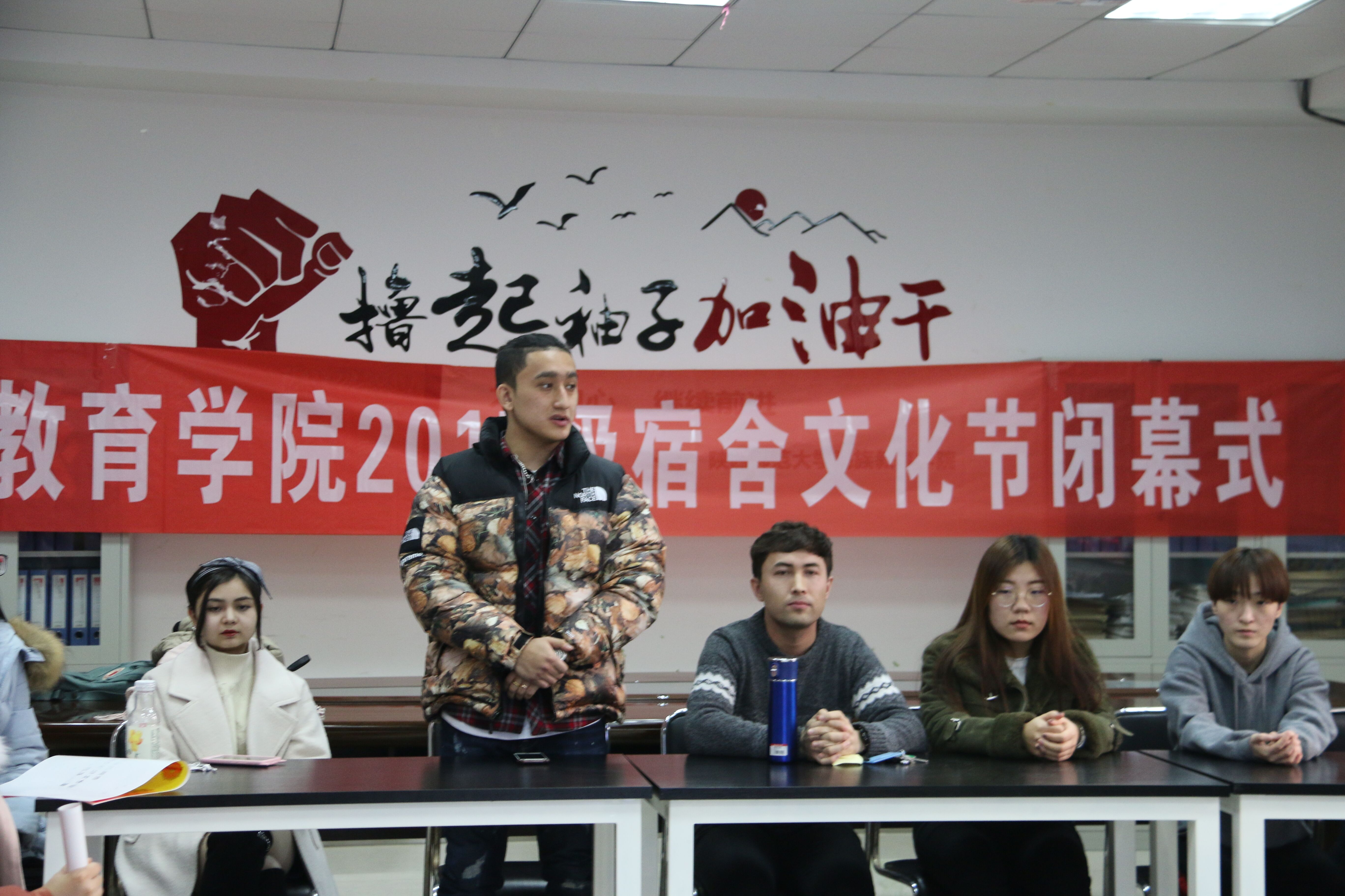 颁奖环节后,员工会主席发言,他说,宿舍就是我们的第二个家,同时对同学们为营造温馨宿舍环境的热情给予赞扬。最后,公司辅导员热依木老师总结讲话,他向组织本次寝室文化节的员工会成员及参加这次文化节的闭幕式的老师和同学们表示由衷地感谢。还表示从这次文化节活动中,他看到了每个人的付出,也看到了同学们展示的各民族的文化以及特色食品,并希望同员工们在今后的学习和校园生活中,要本着“创新、协调、绿色、开放、共享”的发展理念,学习和践行社会主义核心价值观,不断体验和传承中华文化,陶冶情操,塑造灵魂,再接再厉,继续发扬民教院的风采,健康成长成才。
