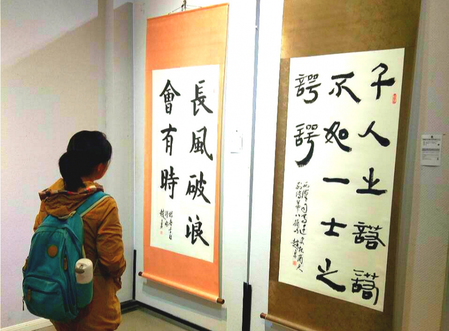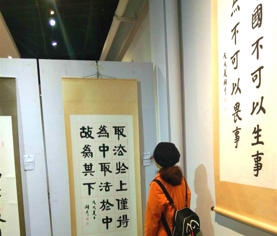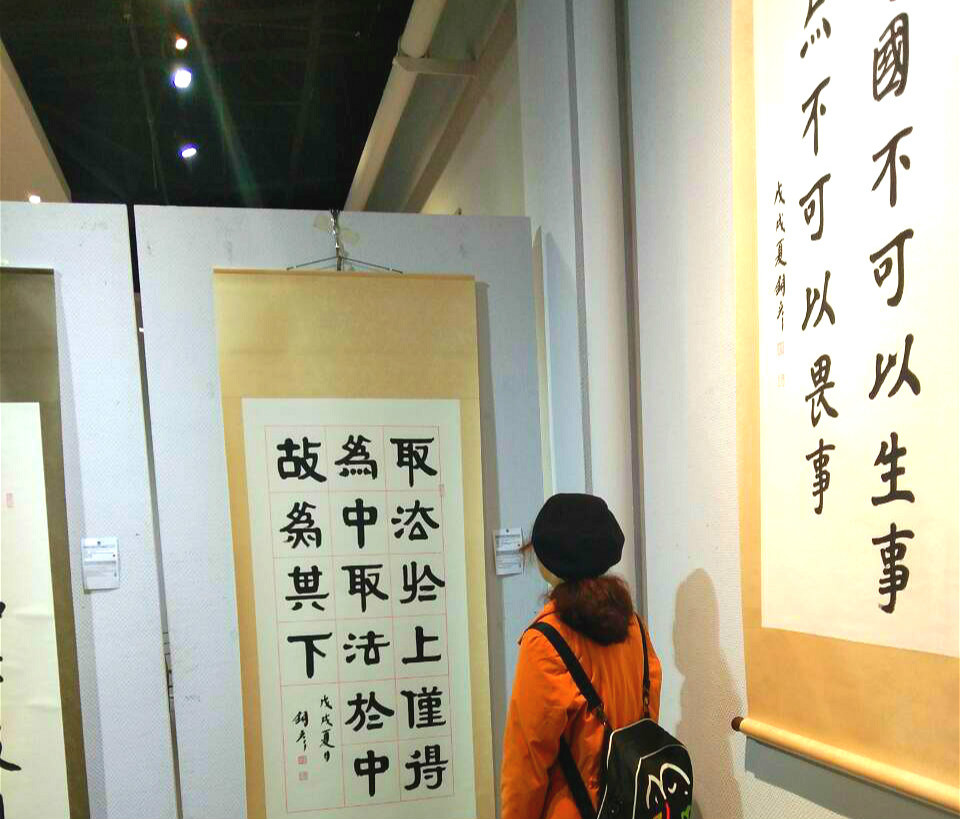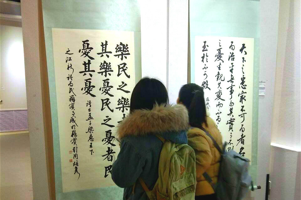 观展活动开始前,马进龙同学就此观展活动意义和目的做了简单的说明,并强调了本次活动的相关注意事宜及安全纪律。展览开始,大家进入展厅自由参观书法作品。在敞亮的大厅里悬挂着一幅幅出自当代名家的书法作品,这些书法名家以不同的字体撰写习近平总书记用典金句50余幅,他们行云流水,笔走龙蛇的作品引起同学们由衷的赞叹,大家纷纷拿出手机,希望可以把这些精美优秀的作品分享给身边人,使更多的人欣赏中华优秀文化作品。作品旁边还有小标识贴用中英文两种语言为参观者介绍各种字体特点、历史渊源、以及习总书记用典金句的出处和相关背景知识,使得大家在欣赏书法的同时也了解到了金句的背景知识和内涵。最后,大家在展厅中心合影留念,为此次观展活动画上完美句号。
