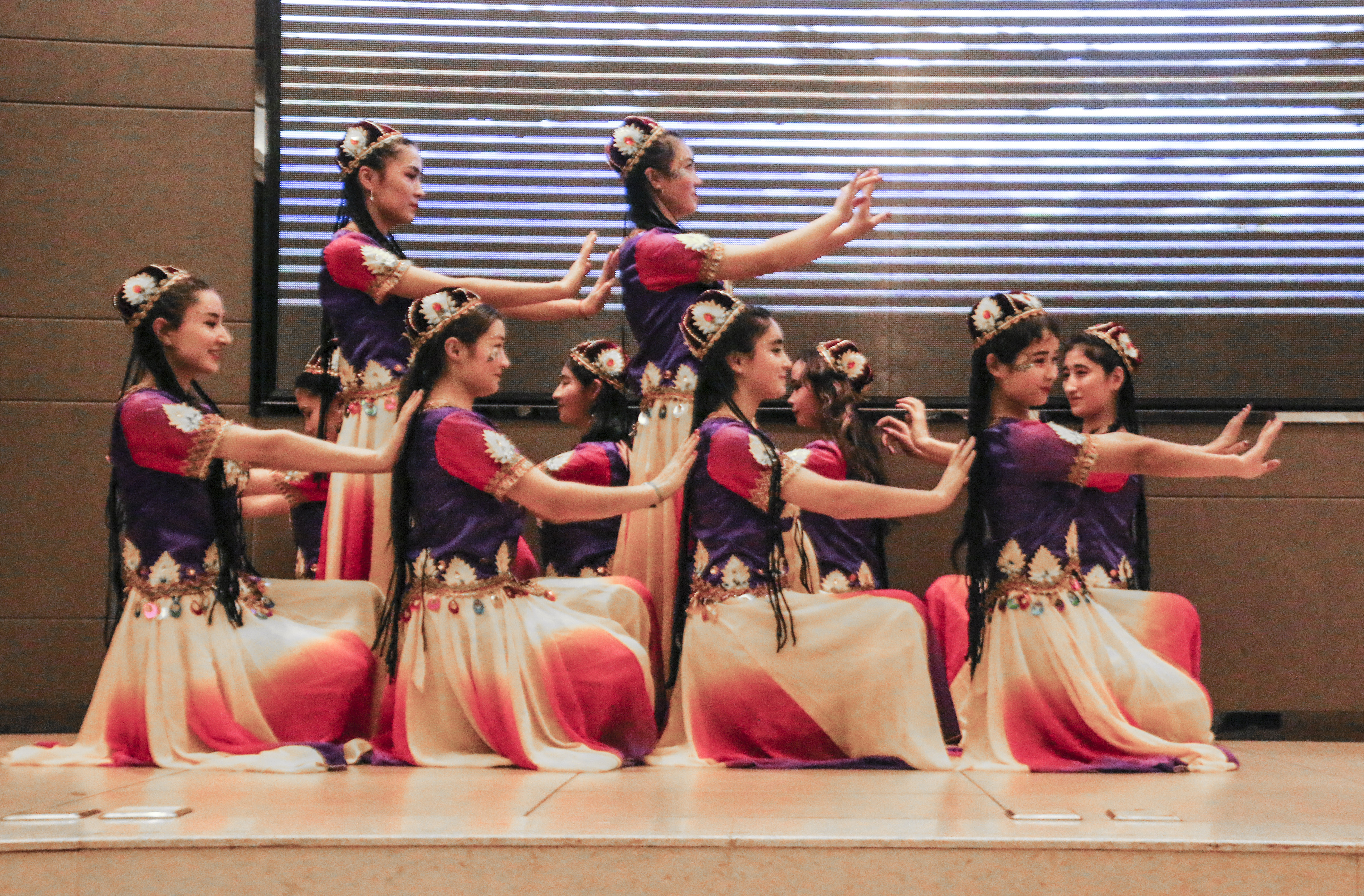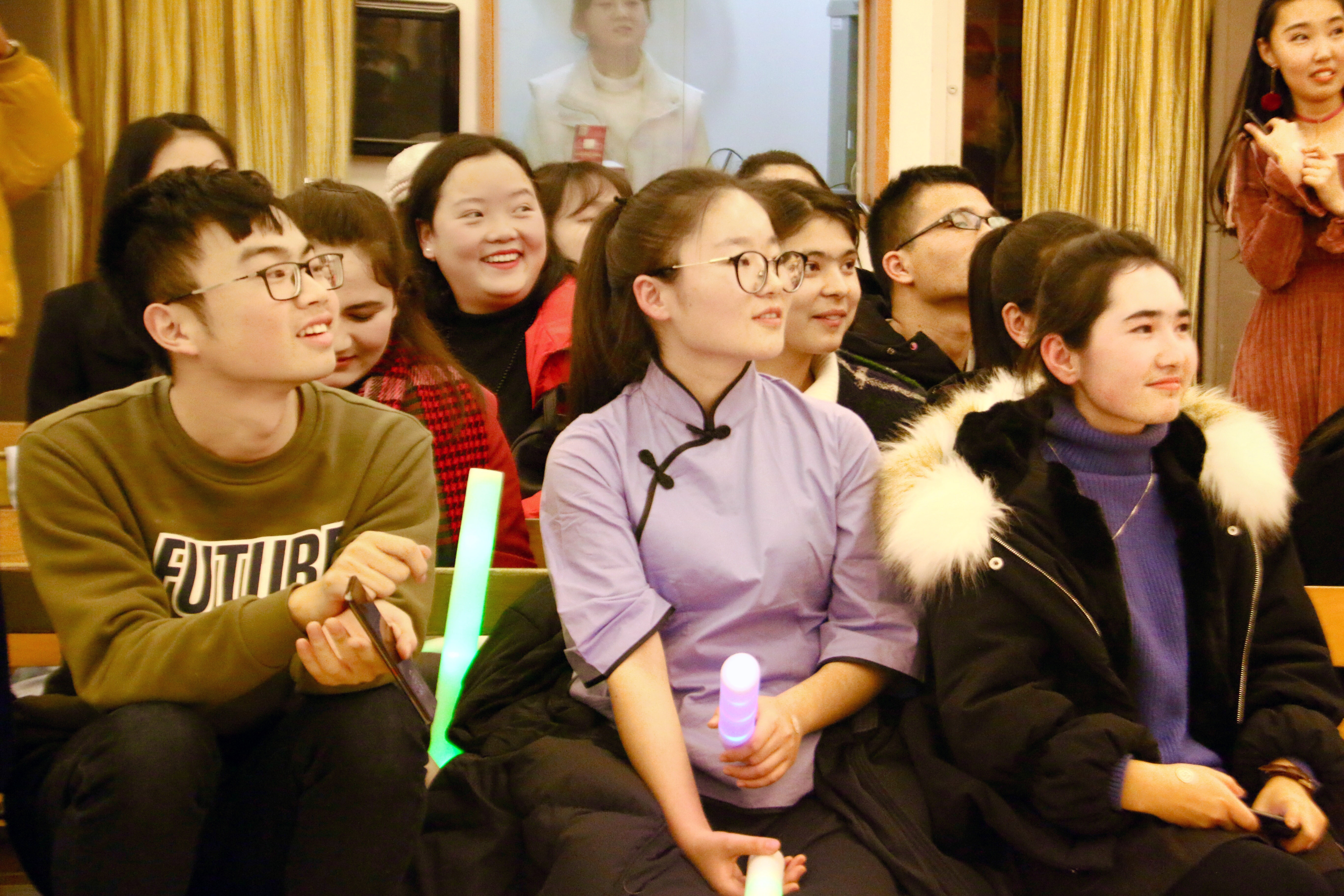 开场舞《我们最青春》为现场带来热烈了气氛,随之而来的吉他弹唱让大家回忆起了那些美好的岁月;朗诵节目表达出了新时代青年报效祖国的决心;两个小品深发了同学们对青春的思考;电台歌曲串烧让远在他乡的游子收到了一份来自家的温暖;哈萨克族与维吾尔族舞蹈与观众近距离互动,展现出各民族热情和风采;紫云相声社的相声使观众捧腹大笑;爵士舞蹈和塔吉克族舞蹈作为第一次出现在舞台上,用舞蹈展现出青春时期爱情的勇敢与细腻,欢快的音乐声伴随着着观众们激动的情绪,现场气氛走向高潮。期间还进行了师生互动和抽奖环节让大家彼此分享新年的快乐和抽到奖后的内心感想。晚会接近尾声,一位来自西安外国语大学的朋友为大家弹奏一首抒情吉他曲,现场观众轻声附和,温暖的声音回荡在晚会现场,迎新晚会就在这温暖的歌声中圆满结束。