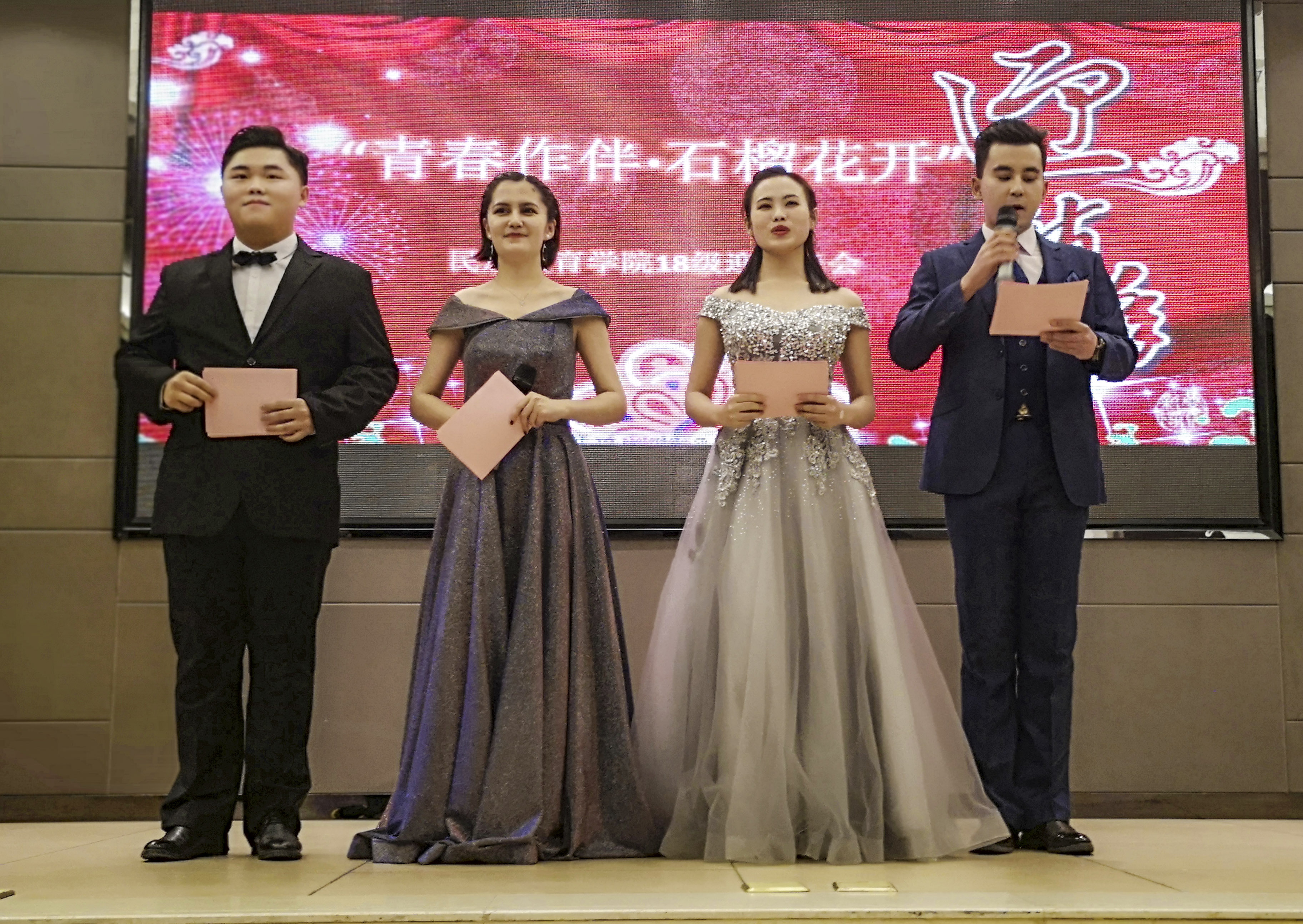 为迎接2018级新生暨迎2019新年的到来,展现公司莘莘学子的风采。12月21日19时,由公司员工会主办,以“青春作伴,石榴花开”为主题的迎新晚会在公司雁塔区启夏苑二楼多功能厅拉开帷幕。公司经理冯建新,副经理窦文阳,西安外国语大学辅导员哈斯铁尔,公司教师代表戴妍、唐涛、刘丁等各科老师,班主任乔露、谢欣然,专职辅导员热依木,兼职辅导员王国昌、许珊共同出席了此次晚会。