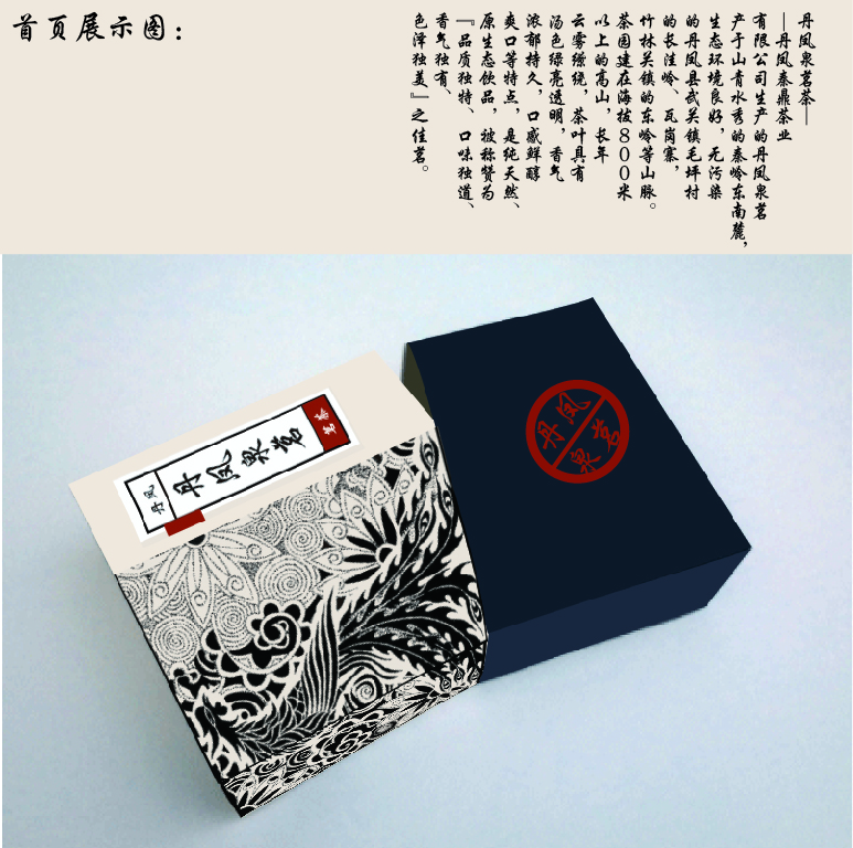 作品简介:一方水土养一方人,而丹凤县就是用茶叶来养育着它的百姓。茶叶包装的外壳图案结合了丹凤县里的“凤”字和茶叶的形状,以茶为凤麟,用黑色和白色为主色,再用红色加以点缀,一只富有特色凤油然而生,产品包装设计主要趋向于古典风格,产品名称包括产品主要成分表、产品生产地址均采用古典书籍、药品类标题包装外观为主要灵感来源,字体为“华文行楷”稍加设计变形而成,加上产品外壳包装为黑色,使得整个包装更具沉稳色彩,包装外壳上加上红色“丹凤泉茗”字样,简单明了又不失大气,符合茶叶类包装的设计风格,同时也体现了丹凤县的特色,做到了合二为一。