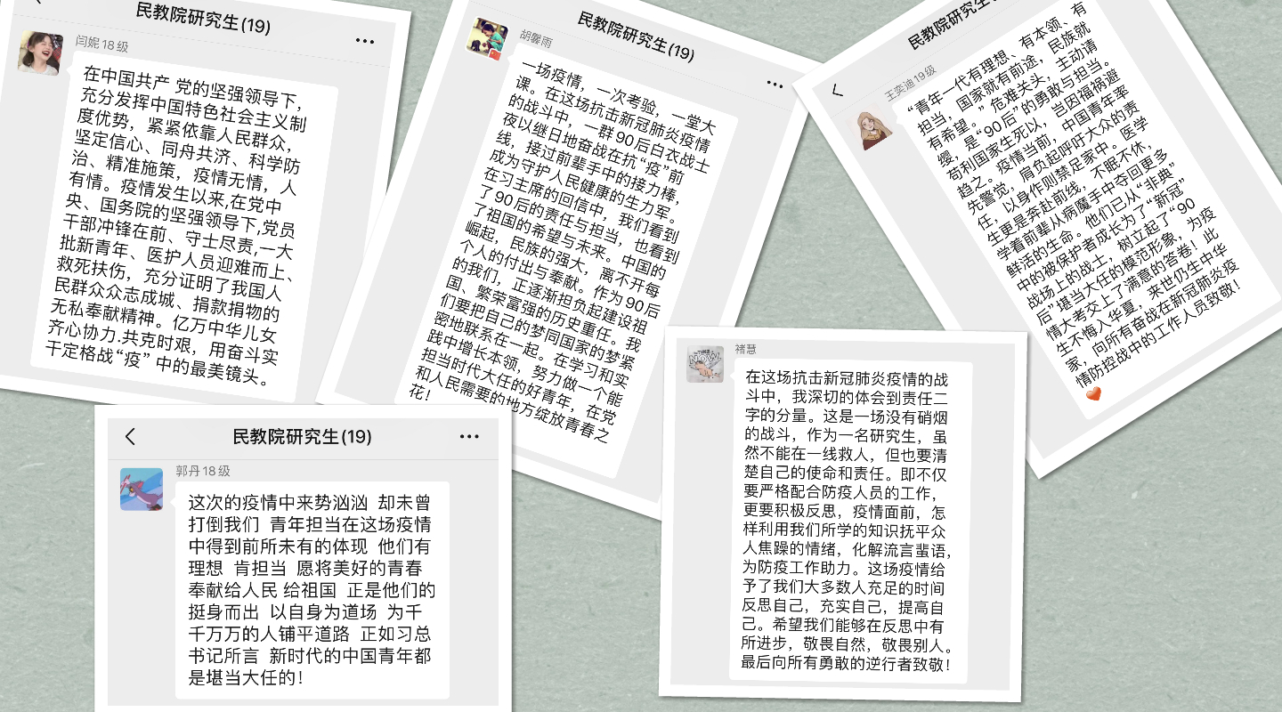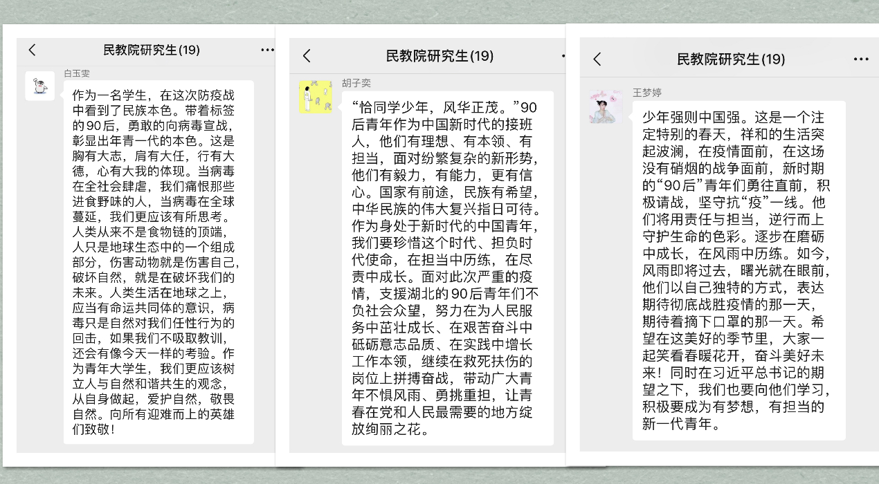 习近平总书记在回信中指出:“青年一代有理想、有本领、有担当,国家就有前途,民族就有希望。”疫情面前年轻的战士们用汗水书写忠诚,用行动践行使命,让“90后”群体在这场疫情“大考”中夺目出彩,公司研究生冯祎洁在讨论中说道:“曾经被保护的‘90后’们,在疫情面前挺身而出,冲锋在前,贡献自己的青春力量。一个个破茧陈蝶的报国故事,让我们看到了当代青年在责任担当中青春的‘蝶变’,同作为‘90后’的我们亦应将危机作契机,在挑战中担起社会责任,实现自己的人生价值。”