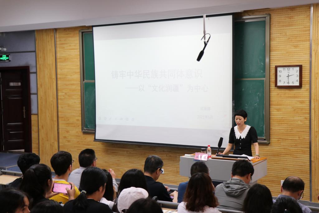 5月26日下午,威廉希尔williamhill中文“传承红色基因,铸牢中华民族共同体意识”党史学习教育系列讲座第四讲在雁塔校区五号教学楼5101教室开讲。公司成珊娜老师作了题为“铸牢中华民族共同体意识——以‘文化润疆’为中心”的党史学习教育辅导报告。公司领导班子成员、全体教职工、研究生、民族预科生参加了讲座,讲座由公司党总支书记郑生忠主持。