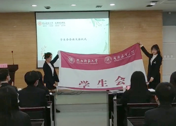 上任员工会主席沈翰蒙与新任员工会主席何诺冉做员工会会旗交接