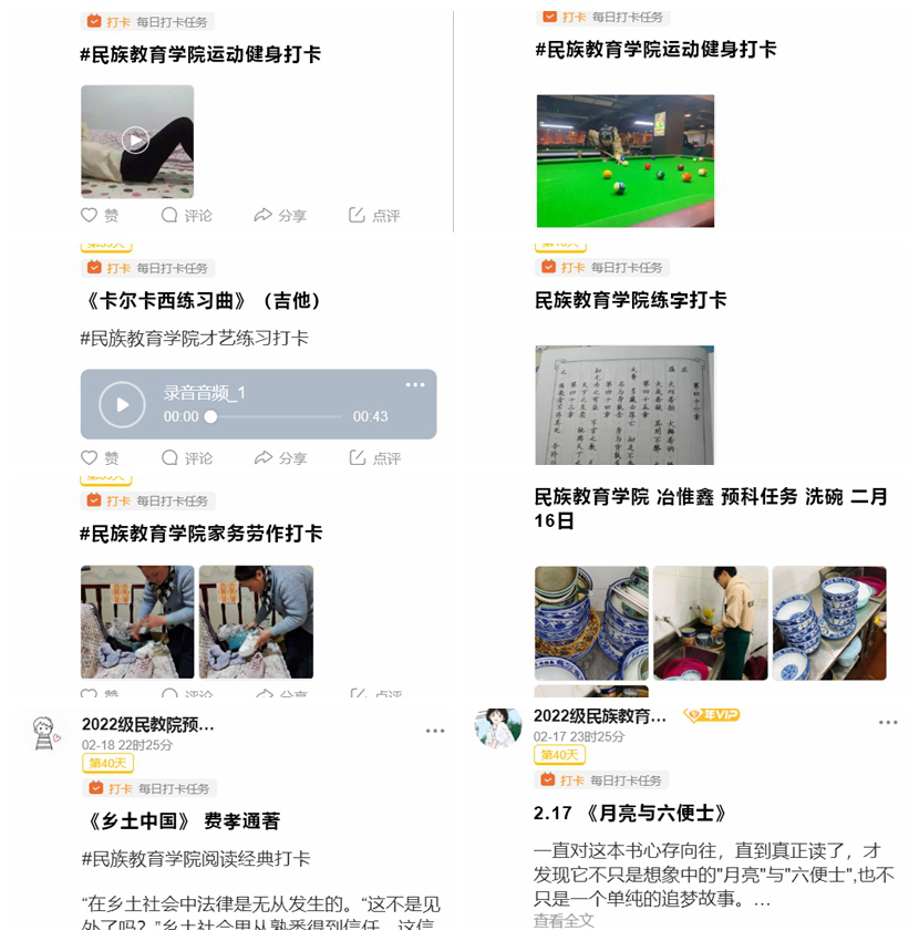 切实落实励学打卡,有效促进员工全面成长。公司引导全体预科生结合个人兴趣爱好和实际,积极参与“励学成长寒假打卡”活动,在经典书目阅读中汲取知识养分、在运动健身锻炼中强健个人体魄、在才艺磨练学习中发掘自我潜力、在家务劳作体验中感受劳动魅力。建立“打卡”圈子,借助“打卡结果共享”的方式在全院范围内形成良好氛围,激励员工良性竞争、不断进步,对于帮助员工养成健康积极、自律向上的良好学习生活习惯发挥了巨大作用。