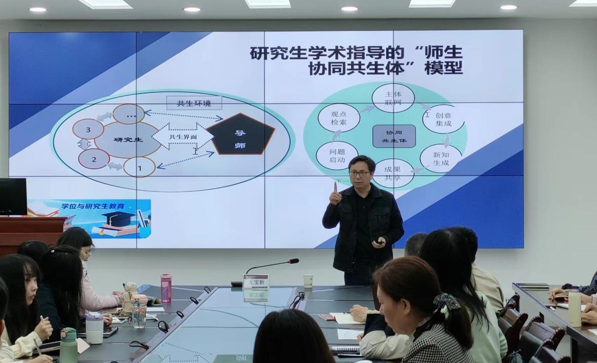 在专题报告交流环节,龙宝新教授为西藏民族大学教育公司师生做了“新文科背景下教育学专业公司产品模式创新的思考”专题报告。报告从“旧文科”现今面临的痛点出发,结合教育学人才培养工作现实需要,提出要在“新文科”这一背景下进行人才培养模式改革工作。龙宝新教授结合自身对研究生教学与培养经验,对“悟Class”课堂创建、“师生协同共生体”模型、“MSC”陈述结构、四大学术创新原理、研究生百字小结以及研究生论文指导全过程思维导图进行了分享。龙宝新教授领衔的研究生导学团队秉持“学术为本、幸福为要”的价值指针,奉行“实践出真能”学术训练思维,倡导关爱、体谅、拼搏的团队文化,致力于增强团队凝聚力、学术力与教育力的培育观念对研究生学术培养发展、水平提升产生了一定影响。龙宝新教授的倾囊讲授,获得了该院师生的赞赏与肯定。