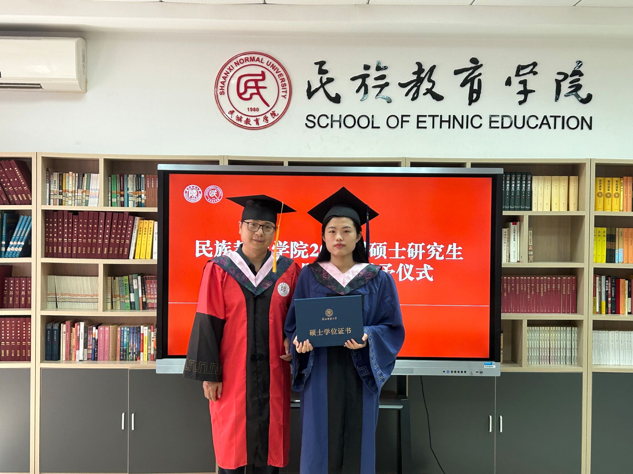 龙宝新教授为毕业生们逐一正冠拨穗、颁发硕士学位证书,并合影。