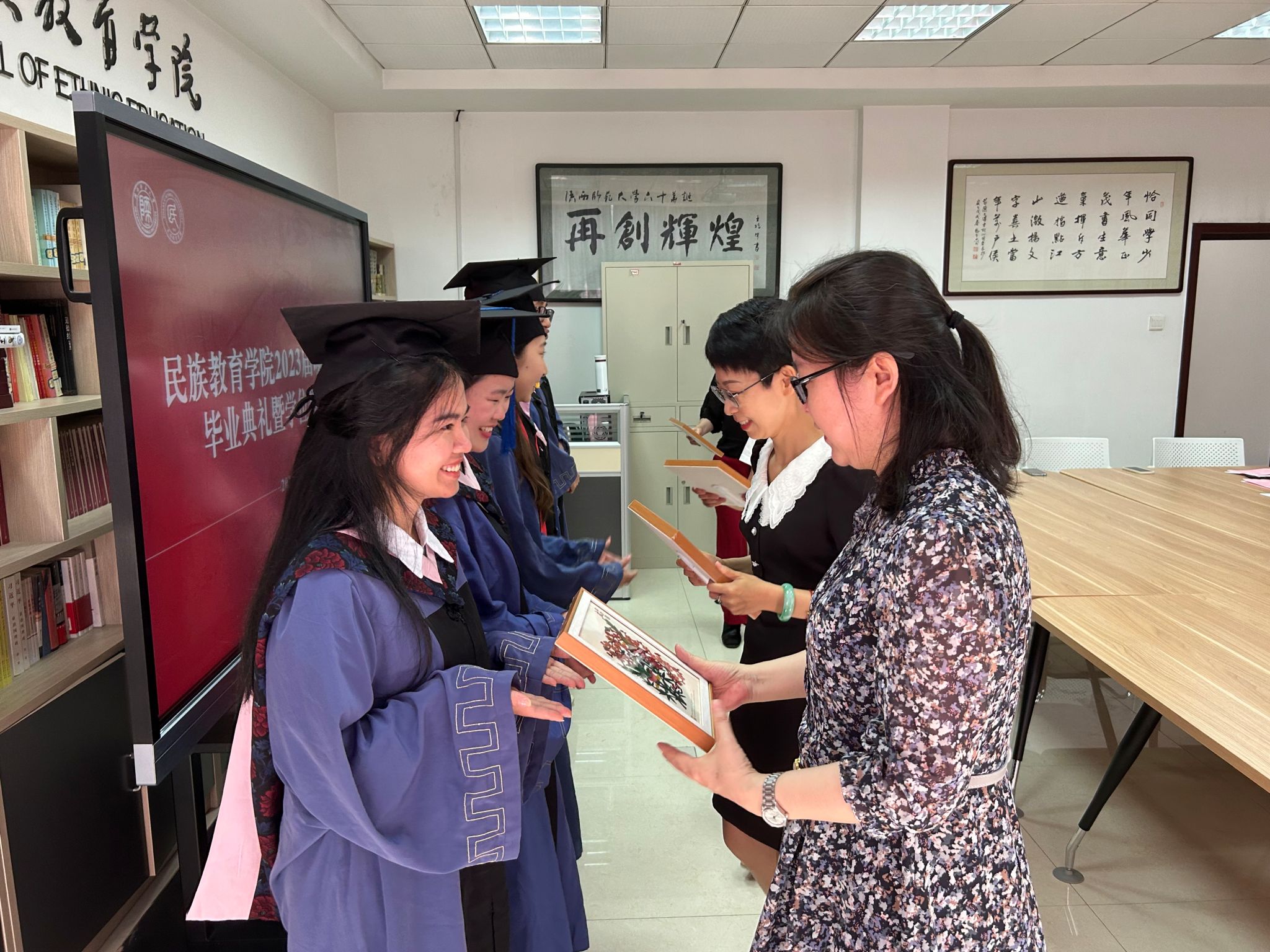 公司教师代表为毕业生赠送毕业礼物。