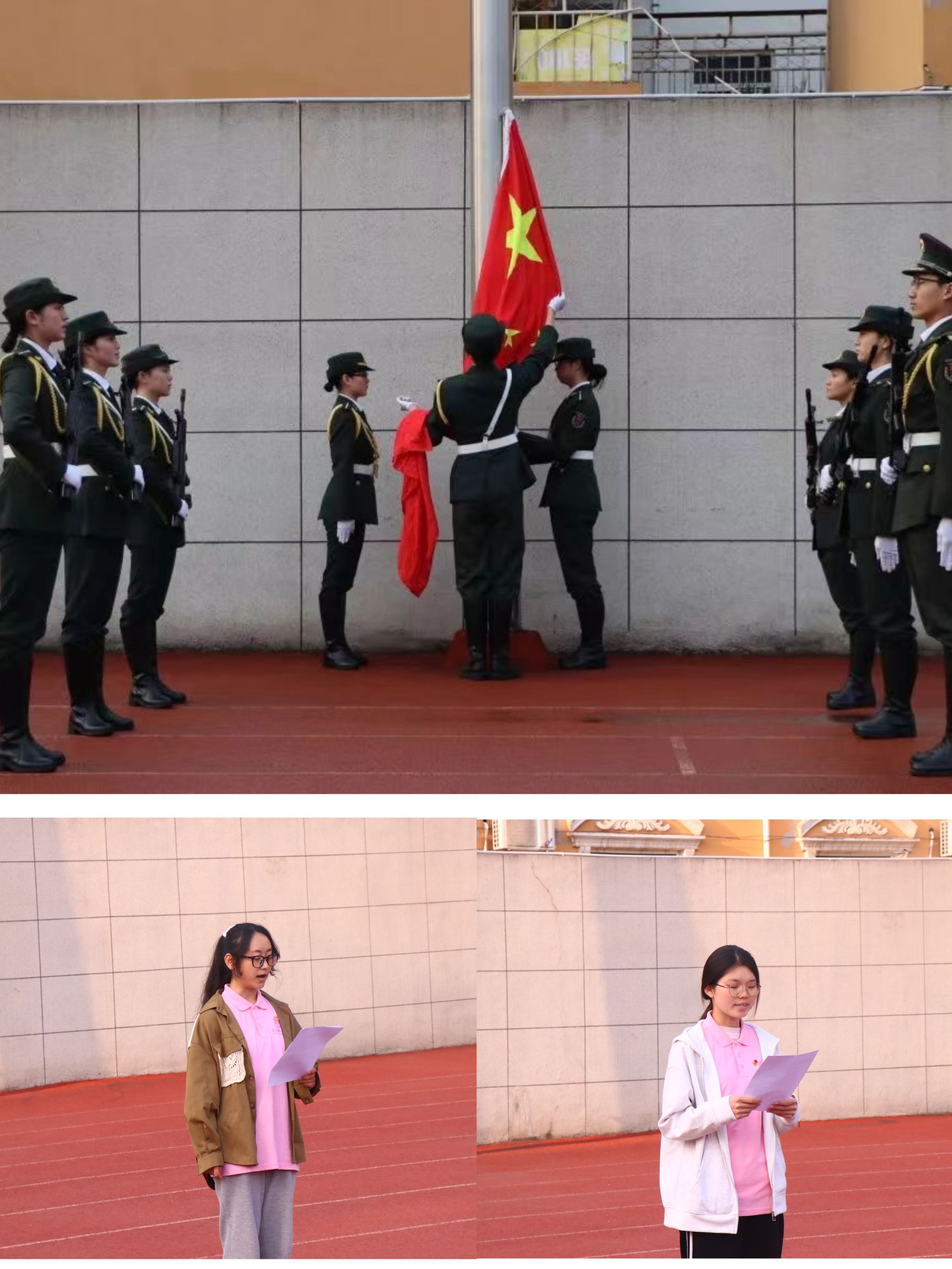 七时,英姿飒爽的国旗护卫队旗手们迈着铿锵有力的步伐,护送着国旗徐徐前进,他们目光坚定、神色肃穆。庄严的国歌声中,五星红旗迎风升起,全体师生面向国旗齐唱国歌、行注目礼。