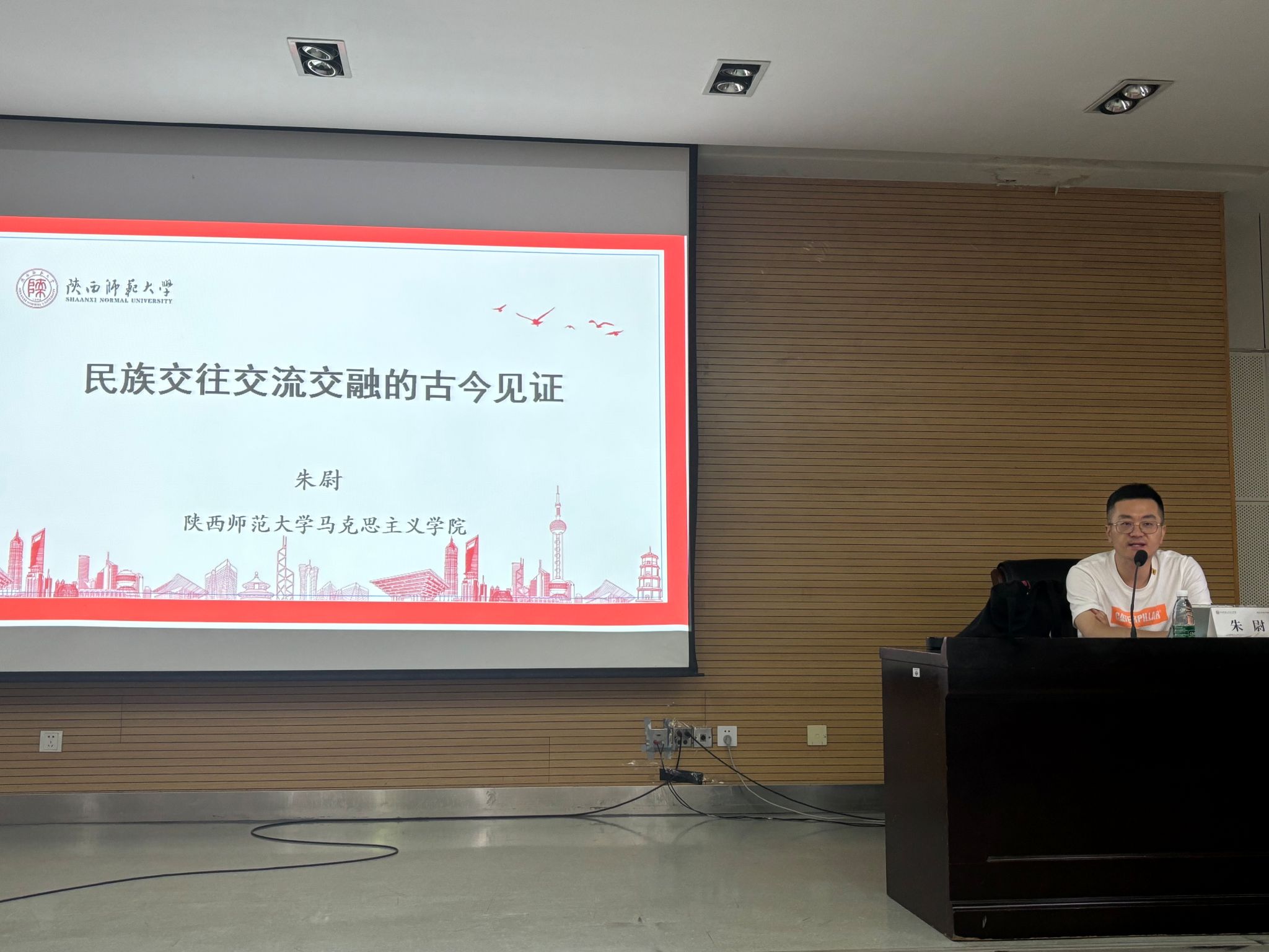 朱尉老师从各民族交往交流交融的科学内涵、历史根基、主要内容等方面进行了阐述,并通过阐释“四个共同”和“四个与共”,对中华民族共同体和各民族的交往交流交融的整体史观作出精准解读。他指出我国历史演进的特点,造就了各民族在分布上的交错杂居、文化上的兼收并蓄、经济上的相互依存、情感上的相互亲近,形成了你中有我、我中有你、谁也离不开谁的多元一体格局,各族人民在长期的生产生活中创造了极为丰富的各民族共同团结奋斗的历史,促进了各民族的交往交流交融,厚植了中华民族团结进步的根基。他号召同学们要高举中华民族大团结旗帜,紧跟时代步伐,坚定理想信念,听党话、跟党走,努力学好专业知识,维护国家统一,民族团结,争做铸牢中华民族共同体意识的坚定信仰者、模范践行者、积极传播者,为民族复兴、强国建设贡献青春力量。