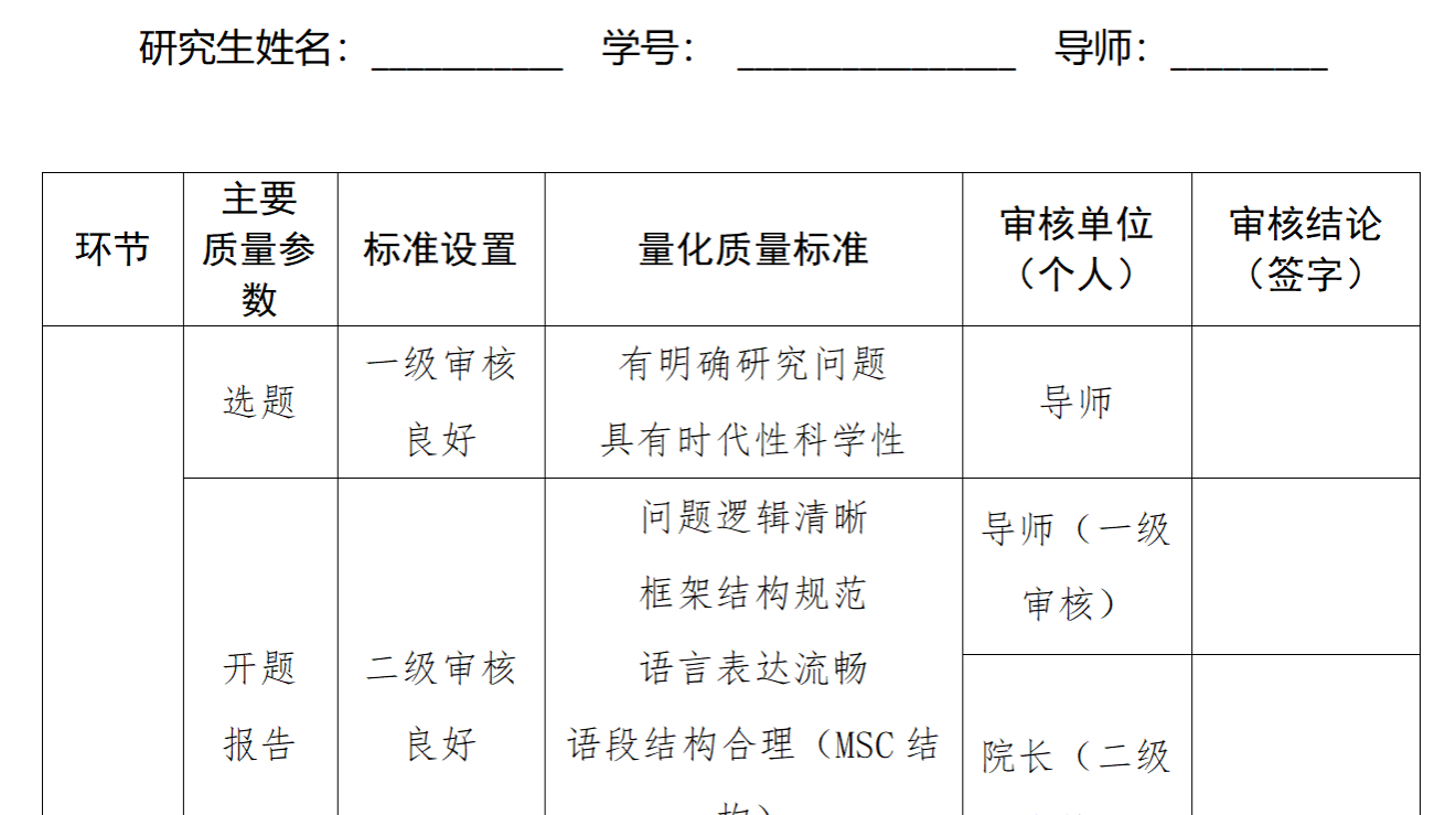 培养过程是研究生质量监控的主体链环,提升培养过程质量管理的科学性与规范性是提升公司产品质量的有力举措。为了全面落实研究生人才培养方案中的各个培养环节要求,威廉希尔williamhill中文创造性地开展了以“打卡来读研”为主线的培养过程质量管理方式改革,收到了较好的改革效果。本项改革的具体做法是:公司出台《公司产品过程管理标准》(试行),将所有人才培养方案规定培养内容,包括课程修读、日常论文写作、学位论文写作、教育实习见习等均纳入《标准》管理范围,并具体设定质量标准与具体审核人,其中开题报告、学位论文均需经过导师、导师组与经理三级审核,所有环节考核通过后方可进入学位论文答辩环节、获取学位证。根据《标准》,公司为每一位研究生定制了过程性质量管理卡片,具体包括:3个环节(开题选题、日常学习、学位论文)、7个考核指标点、18个签字审核点。在三年学习中,研究生须完成18次打卡考核方可拿到学位证。