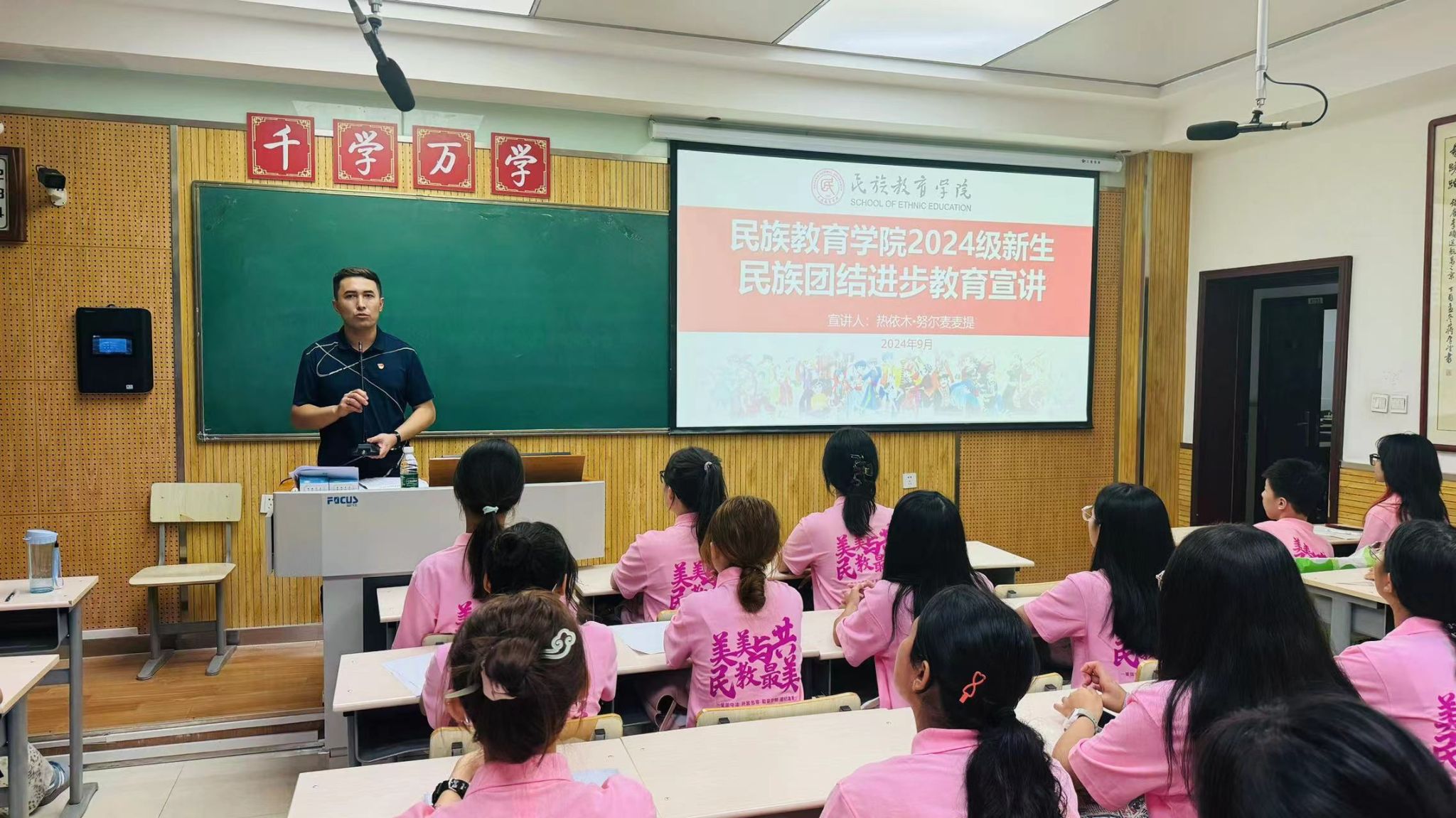 随后,热依木围绕公司始终以铸牢中华民族共同体为主线,全员开展民族团结进步教育的重要性和必要性出发,带领同学们深刻学习领会《中华人民共和国教育法》中“教育与宗教相分离”原则和相关政策的内涵。他结合校内校外发生的真实典型案例,从法律法规、防范电信诈骗、拒绝传销、财产安全、寝室安全、食品安全、出行安全、网络安全等角度切入,讲述了在校老员工可能遇到的各类安全问题与预防措施,进一步强化员工法治意识、纪律意识和底线意识,帮助员工增强抵御和防范安全意识和自我保护能力。
