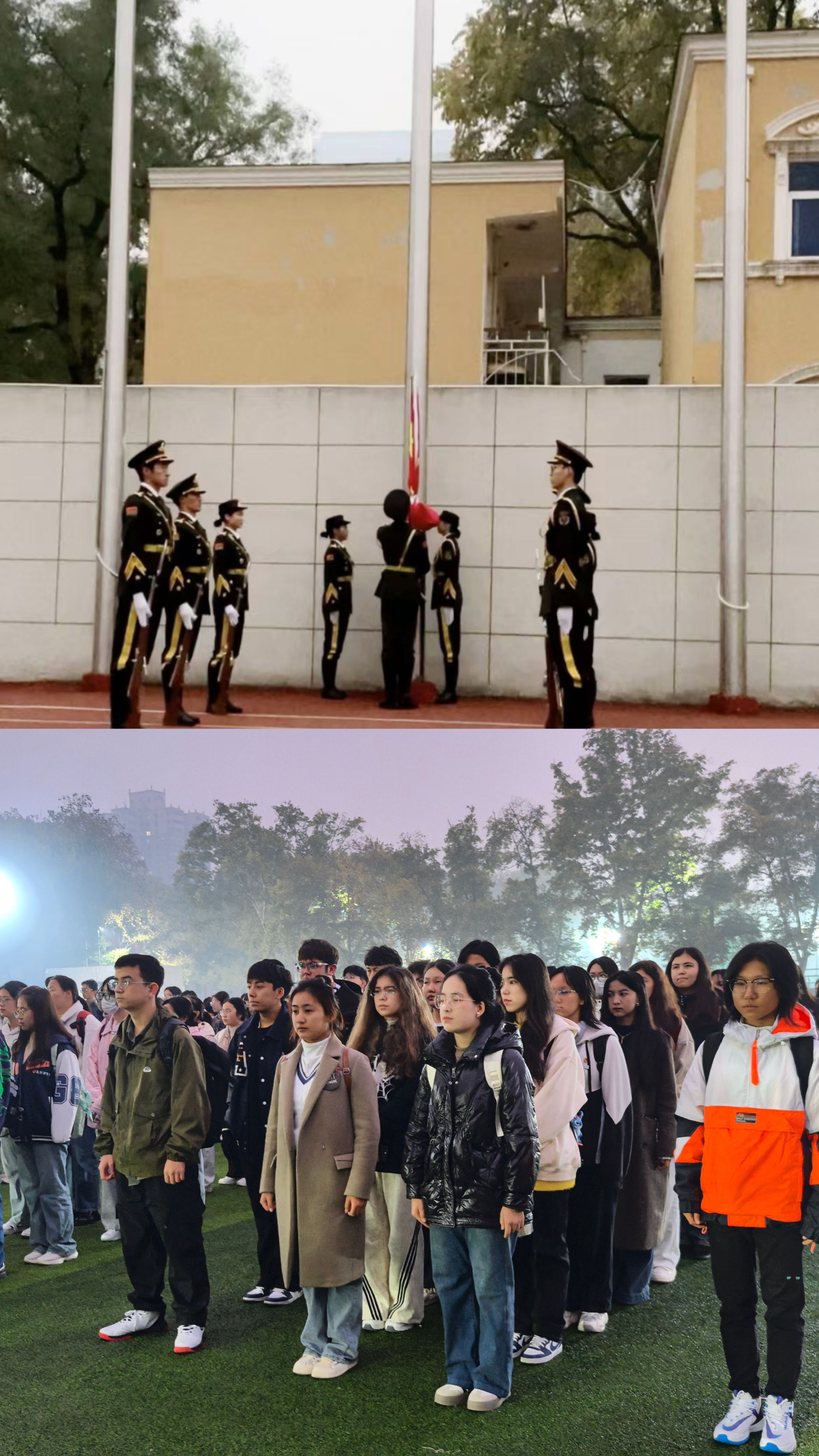 7时整,国旗护卫队旗手们迈着有力的步伐,眼神坚定,护送国旗走向升旗台。庄严的国歌声中,五星红旗迎风升起,全体师生面向国旗齐唱国歌、行注目礼。