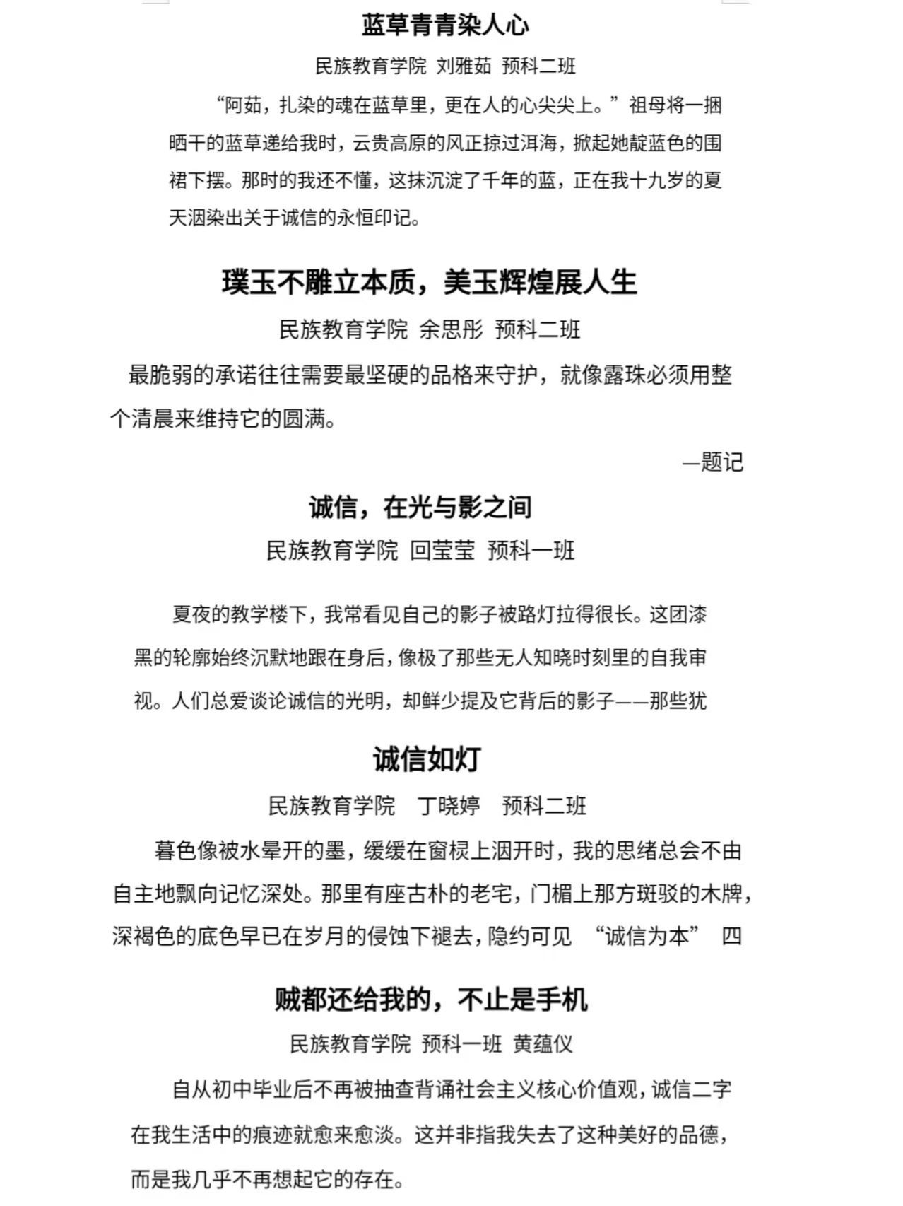 此次诚信主题教育系列活动组织有序、成效显著,让同学们深刻认识到珍惜个人信用、秉持诚信原则的重要性,有效培养了员工的诚信品质,在校园内营造出知诚信、讲诚信、守诚信的良好氛围,树立了民教学子诚信的良好形象。