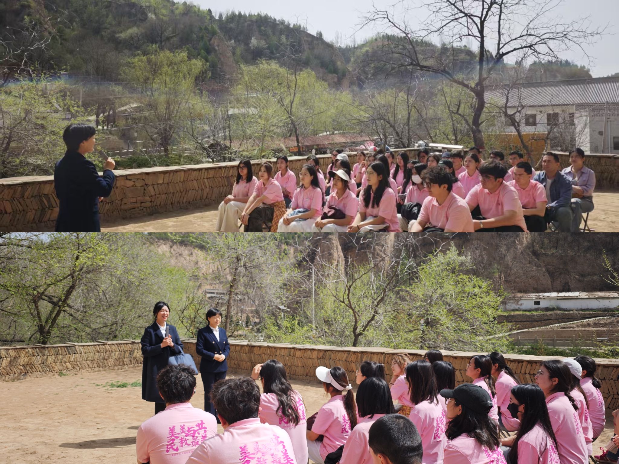 师生们来到枣园革命旧址。作为中共中央书记处所在地,枣园的窑洞群与中共中央书记处小礼堂保存完好。当年毛泽东常在这里秉烛夜读、撰写文章,《为人民服务》《纪念白求恩》等光辉著作均诞生于此。讲解员讲述的“幸福渠”修建往事,展现了党中央与群众同甘共苦、共谋发展的鱼水深情,让大家对“全心全意为人民服务”的宗旨有了更深刻的体悟。